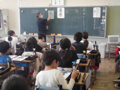教頭先生と一緒に「書写(毛筆)」の授業です。