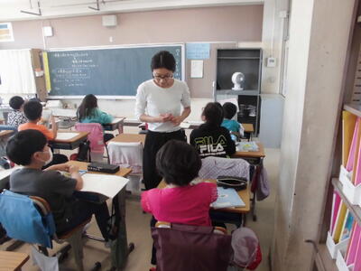 5年生 担任と社会科の学習をしたり、 教頭先生と習字の学習をしたりします。「草原」と書いていました。
