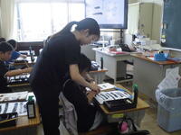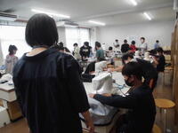 6年生 家庭科 エプロン作りに、お母様方のお力をお借りしました。おかげさまで、スムーズに進みました。