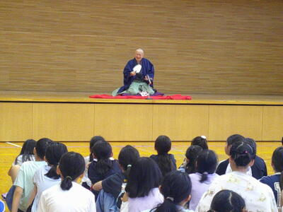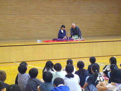 落語教室 投稿日時 : 07/02 宮久保小学校管理者 4年生は国語で落語の学習をしています。 今日は、落語家 三遊亭円福師匠をお招きし、落語をご披露いただきました。 話術はもちろんのこと、手ぬぐいや扇子の使い方や表情など、学ぶことが多く、落語の世界に引き込まれ、大笑いを繰り返したひと時でした。