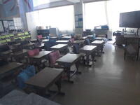 教室の扉の窓越しに撮影しました。入口に机をいくつかおいて支えにしています。あとは、奥でひっそり隠れています。