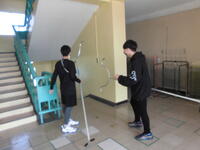 児童が安全に隠れたら、さす股をもって、集合する職員がいます。