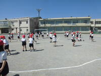 業間の様子 1年生も本日から、業間校庭で遊んでいます。黄色い帽子が1年生です。