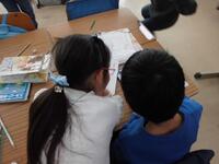 先日、校内の先生たちにインタビューした内容の発表準備です。グループごとに案を練ったり、練習したりしていました。担任の先生にアドバイス