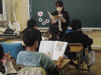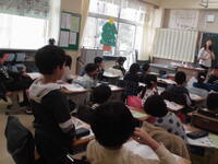 1年4組は道徳です。 横断歩道を渡るときの手のあげる意味や車が止まってくれたときの気持ちを考えます。