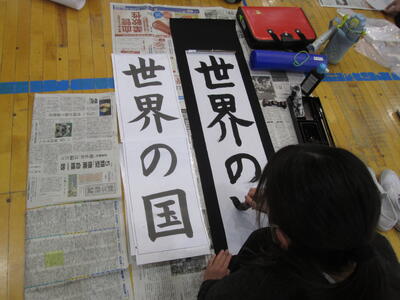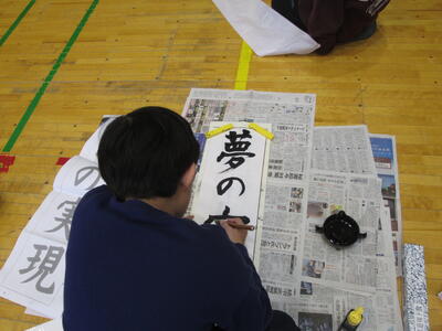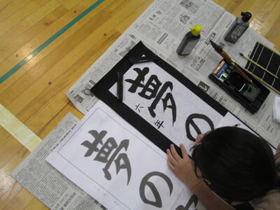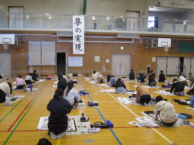 シーンと静まり返った体育館で、これまでの練習の成果を筆に込めていました。