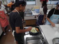 調理実習で野菜炒めを作っていました。上手な手さばきの子もいれば、おっかなびっくりの子もいました。