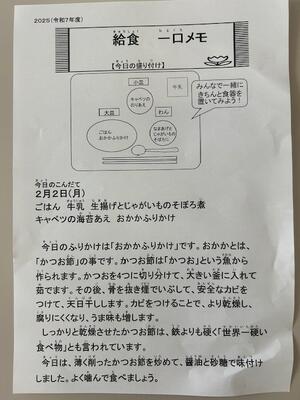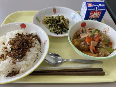 ごはん・牛乳・生揚げとじゃがいものそぼろ煮・キャベツの海苔和え・おかかふりかけ