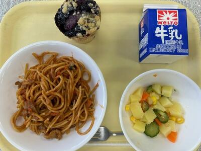 スパゲティナポリタン・牛乳・マセドアンサラダ・ブルーベリーケーキ