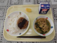 ごはん、牛乳、塩昆布メンチ、小松菜の味噌汁、柿