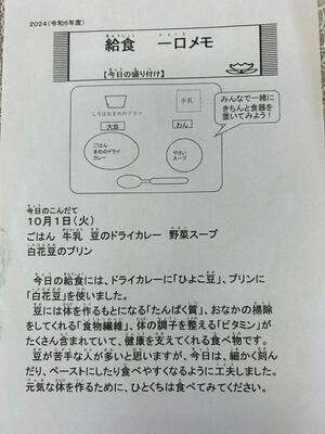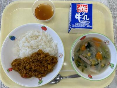 ごはん・牛乳・豆のドライカレー・野菜スープ・白花豆のプリン