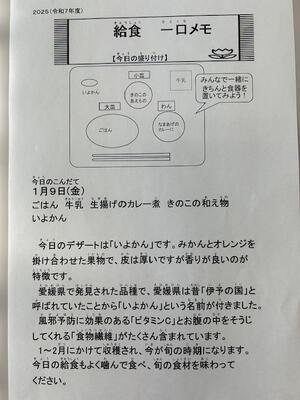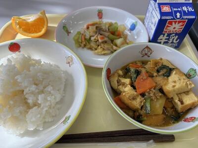 ごはん・牛乳・生揚げのカレー煮・きのこの和え物・いよかん