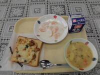 照り焼きピザトースト 米粉豆乳コーンスープ みかんヨーグルト 牛乳