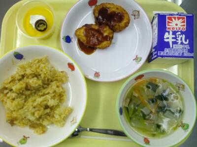 焼肉ピラフ・牛乳・豆腐ナゲット・白菜のスープ・かぼちゃプリン