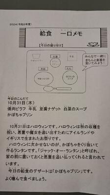 豆腐ナゲットは、意外とボリューム感があり、食べごたえがあるのにヘルシーなのでうれしくなります。本日のお祭りにちなんだデザート「かぼちゃプリン」も、栄養満点です。