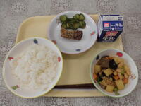 豚肉のかりんと揚げ ネギダレきゅうり 五目煮 ごはん 牛乳