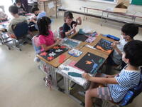上級生の上手な手本をまねして、しあげるこもいました。 光と色のファンタジー。窓に寄せると、もっときれいな作品に!
