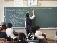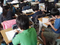 こちらのクラスは教頭先生と書写「毛筆 『つり』」です。 こちらのクラスは避難訓練が雨で中止になったため