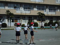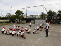 5年生はリズムよく ハードル走を行っていました。 6年生は 50m走とソフトボール投げです。運動能力証目指して