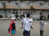 2年生は 4クラスで、リレーを行っていました。バトンはボール。渡すときには後ろのほうへ頭の上を通して渡します。ここで順位の入れ替えが・・・