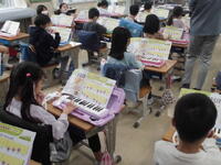 鍵盤ハーモニカで演奏している学級もあれば、鈴やカスタネットを使って演奏している学級もあいました。
