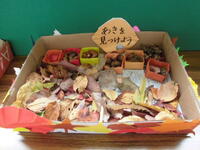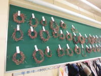 1年生の廊下には秋を感じさせるものが、掲示されました。 リースは自分たちの育てた朝顔のつるで作りました。
