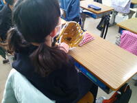 初めにグローブを触って、実際にはめてみました。低学年用は6年生には、厳しい子もいたようです。