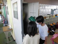 ・掃除用具の点検、6年生が5年生にやさしく教えています