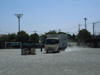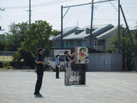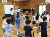体育館で説明を聞いて、横断歩道の渡り方を練習しました。外では、トラックも実際入ってきて、どんな危険が隠れているか学習しました。
