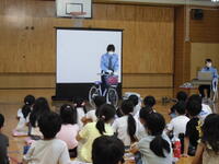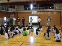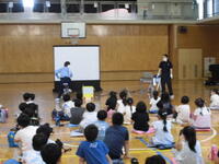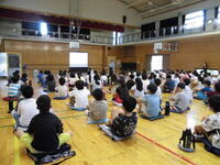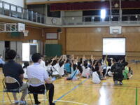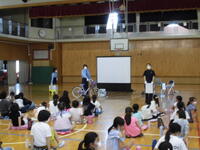体育館で画面を通して説明を聞いた後、自転車に乗っている際の危険につい学習しました。最近は大きな車でもハイブリッドや電気自動車で