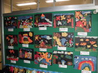 1年生の廊下には秋を感じさせるものが、掲示されました。     リースは自分たちの育てた朝顔のつるで作りました。