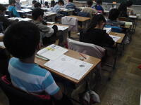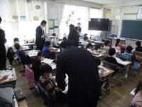 こちらのクラスは教頭先生と書写「毛筆 『つり』」です。                   こちらのクラスは避難訓練が雨で中止になったため