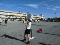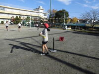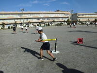6年生は体育で、「ティーボール」を行っています。バットを放り投げると危ないので、打ったら、バットはコーンの中に入れます。