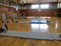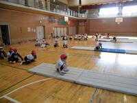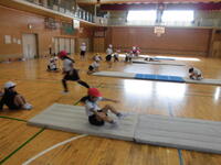 1年生は マット遊びです。(外では、縄跳びを行っています。)