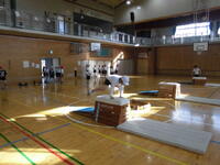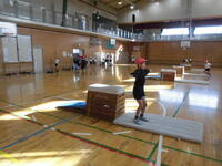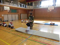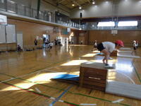 跳び箱運動 台上前転の練習を行っています。はじめは低い段からスタートです。