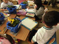 2年生 生活科で植えたパンジーの観察をしています。 葉の大きさ調べたり、花びらの枚数を調べたりしました。