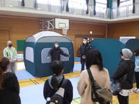 体育館ではAED心肺蘇生と避難所体験などが行われました。 避難所に合うテントは簡単に組み立てられて、しかも広かったです。
