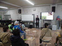 音楽室では、防災講座を聞きます。ロープワークもおこなっていました。 このロープワークは、いろいろなところで役立ちます。