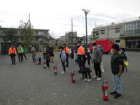 外では、消防署の方に来ていただき、水消火器の体験を行いました。