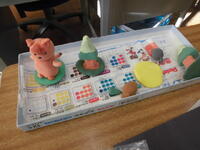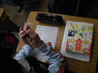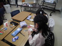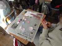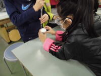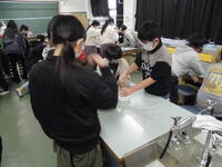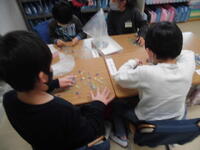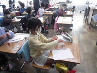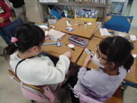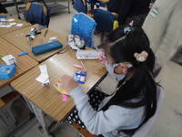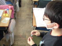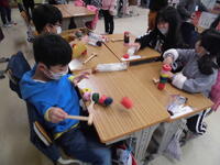 2年生が「パッチンかえる」を作っていました。ゴムの力紙が反り返り、カエルジャンプのように跳ねます。