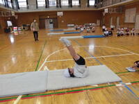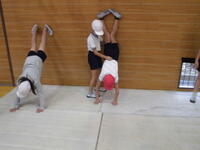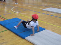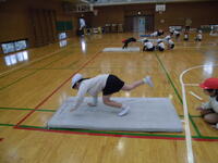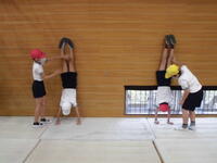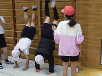 4年生がマット運動で、壁倒立に挑戦中方にしっかり体重が乗らないとつぶれてしまいます。さあ上手にできるかな?