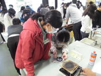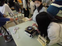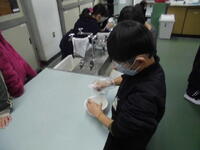 食塩を一生懸命溶かしていました。ろ紙を使って、ろ過していました。今日は寒かったので、飛散防止メガネが曇っていて