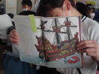 思い思いの絵を塗っていました。かえるが宇宙に到達する絵もありました。