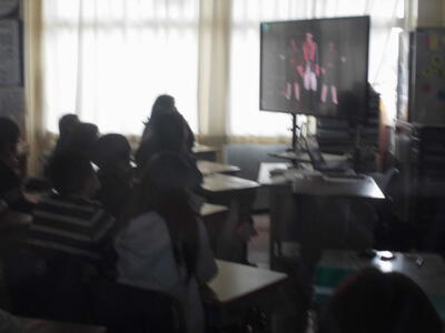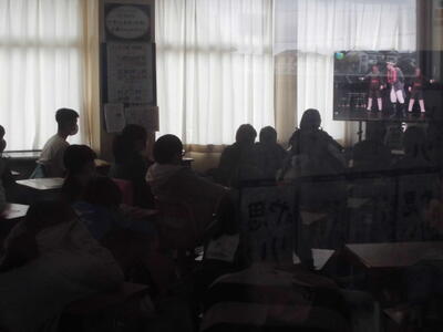 6年生が劇団四季の「人間になりたがった猫」の劇を大型提示装置で鑑賞しました。