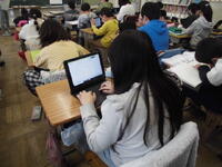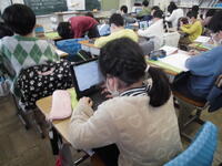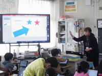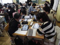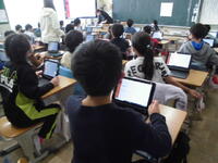 例に学習しています。大型提示装置と子供たちのタブレットには同じ画像を写しています。