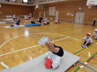 馬歩きにあざらし、カエルの足うちなど準備運動を行って、後ろ転がりと東京タワーに挑戦です。