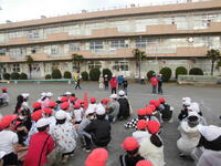 やけに赤い帽子や赤い服の人が多いです。自作の的あてよーく狙って!