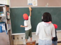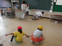 1年生の教室です。6年生が手伝いに来て、掃除を一緒にやったり、掃除の仕方を確認してくれたりします。1年生も掃除が上手になりました。