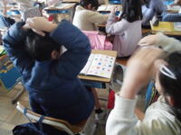 習字をやっているクラスもあれば、               体育の学習 タグラグビーの戦略の立て方を学習しているクラスもあります。