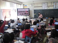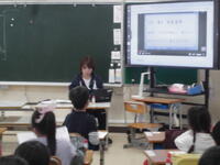 1年4組は道徳です。 横断歩道を渡るときの手のあげる意味や車が止まってくれたときの気持ちを考えます。